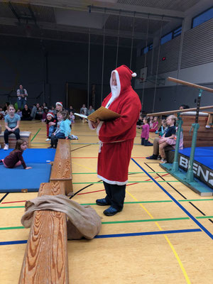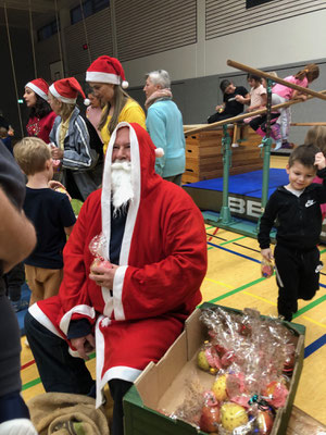Dann ertönte plötzlich eine Glocke und wir bekamen Besuch vom Nikolaus. Einige Kinder durften ihm zeigen, was sie schon alles turnen können - und natürlich hatte er für alle noch ein kleines Überraschungssäckchen dabei.