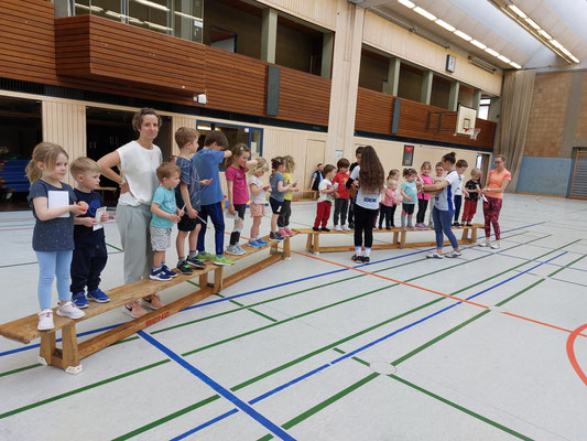 Vor Ort waren unsere 21 turnbegeisterten Kinder und die fünf begleitenden Übungsleiterinnen schnell auf zwei Mannschaften verteilt, so dass wir unter dem jubelnden Beifall der mitgereisten Eltern